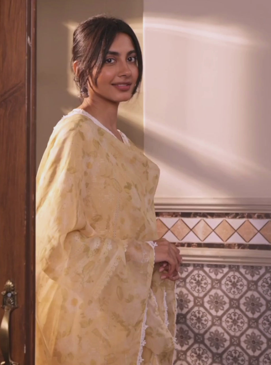 The bottoms echo the floral embroidery detail and share the scalloped finish for a harmonious look. Complete your outfit with a beautifully printed dupatta adorned with lace trimmings, adding a final flourish to this delightful summer ensemble.