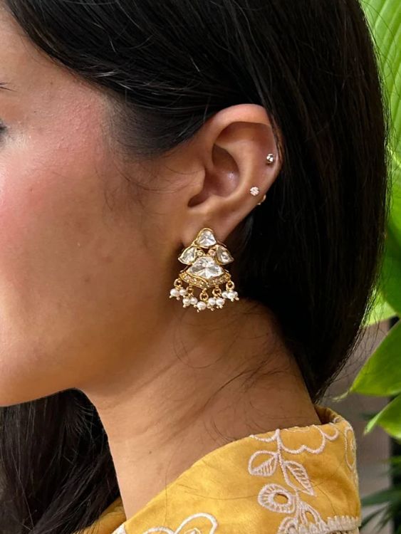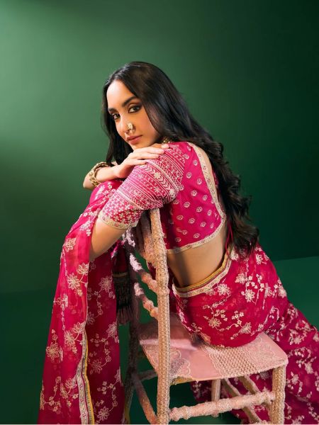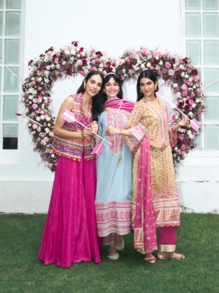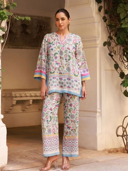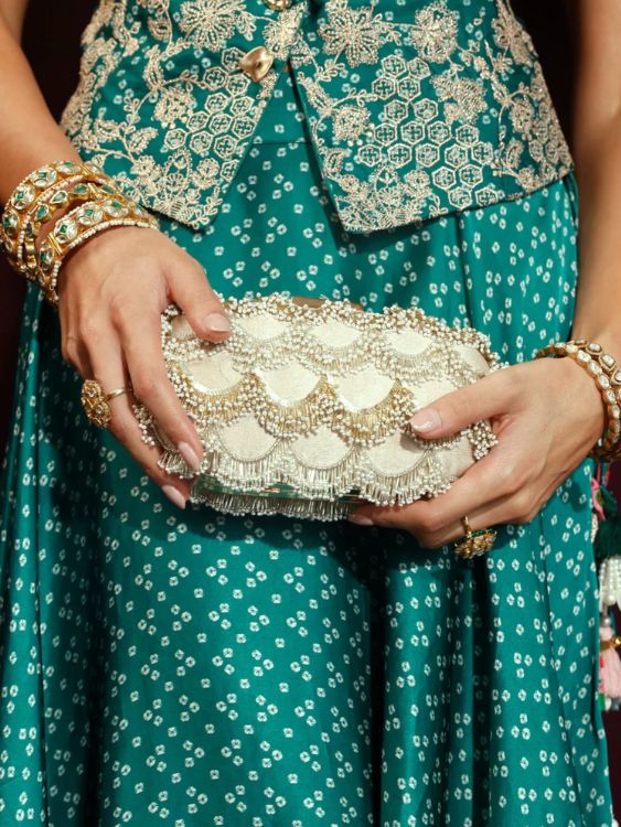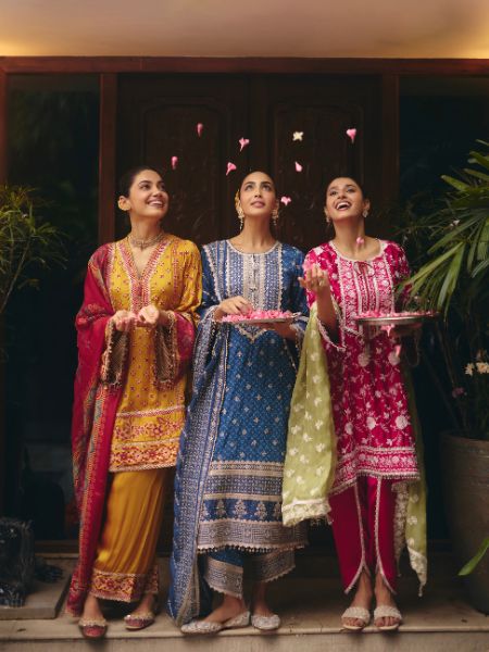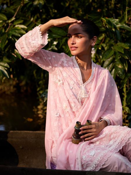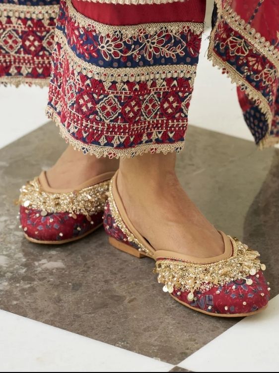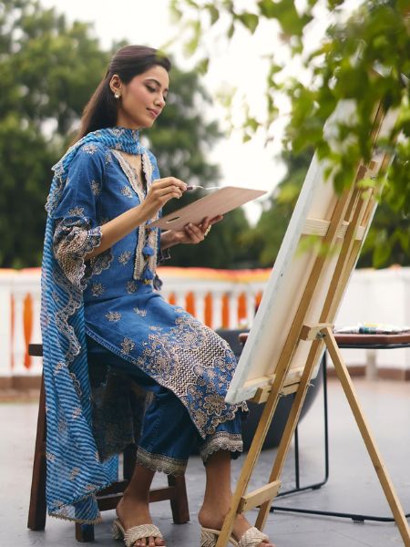 - The denim pants has schiffli embroidery in white all over it with lace detailing
