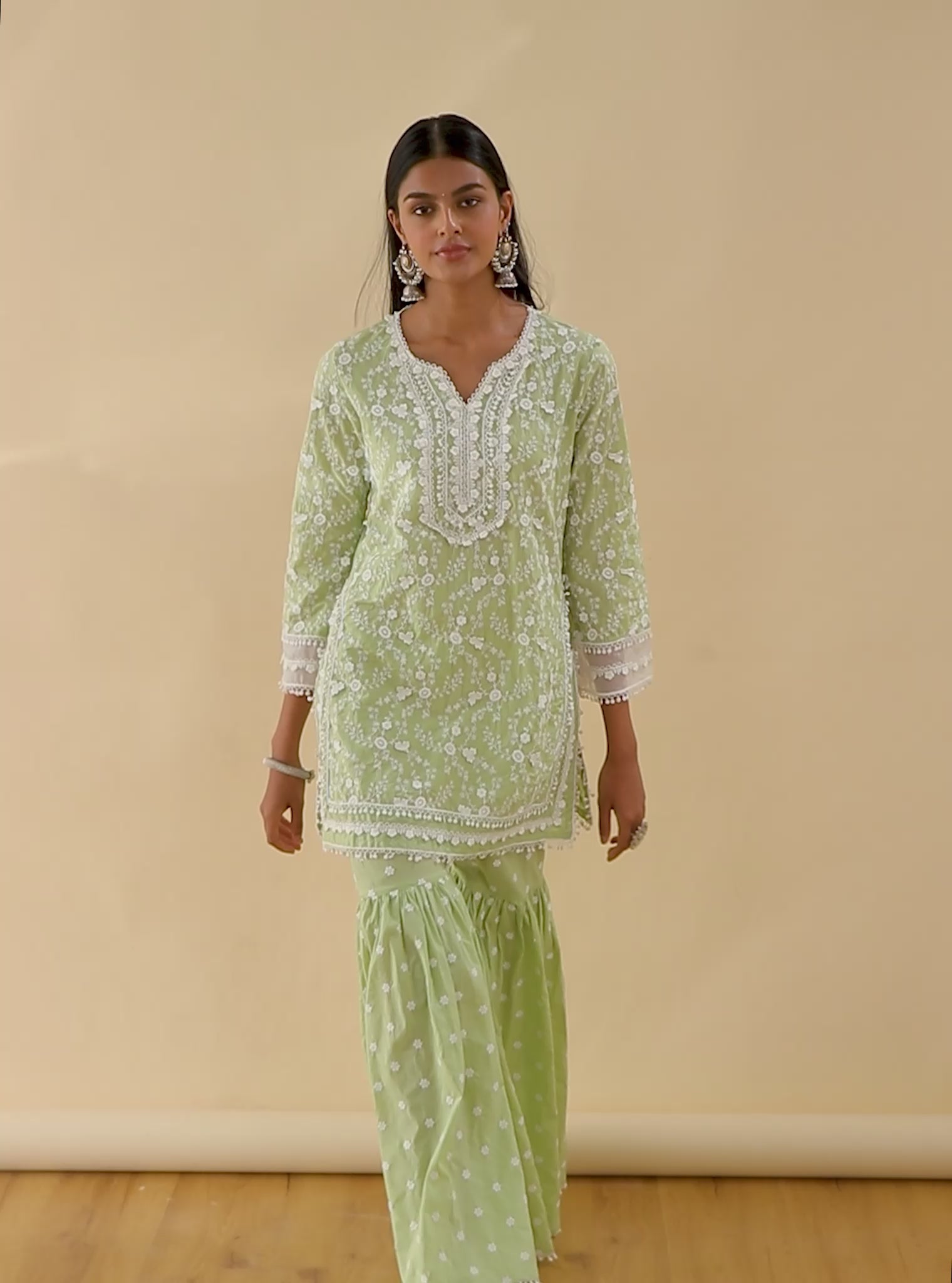 The kanji set in the trending shade of green is a statement for the summer, featuring a short kurta with running floral embroidery enhanced by appliqu?Ÿ’???ƒ???Ÿƒ?????? floral motifs, bell sleeves with organza panels, and double lace trims, and a hemline with minimal lacework to bring a balance. The set comes with a coordinated garara in green with tiny floral motifs.
