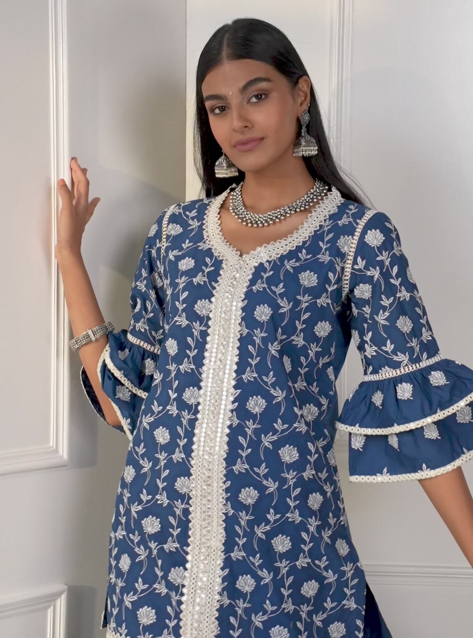 Mulmul Cotton Keziah Navy Kurta With Keziah Navy Garara