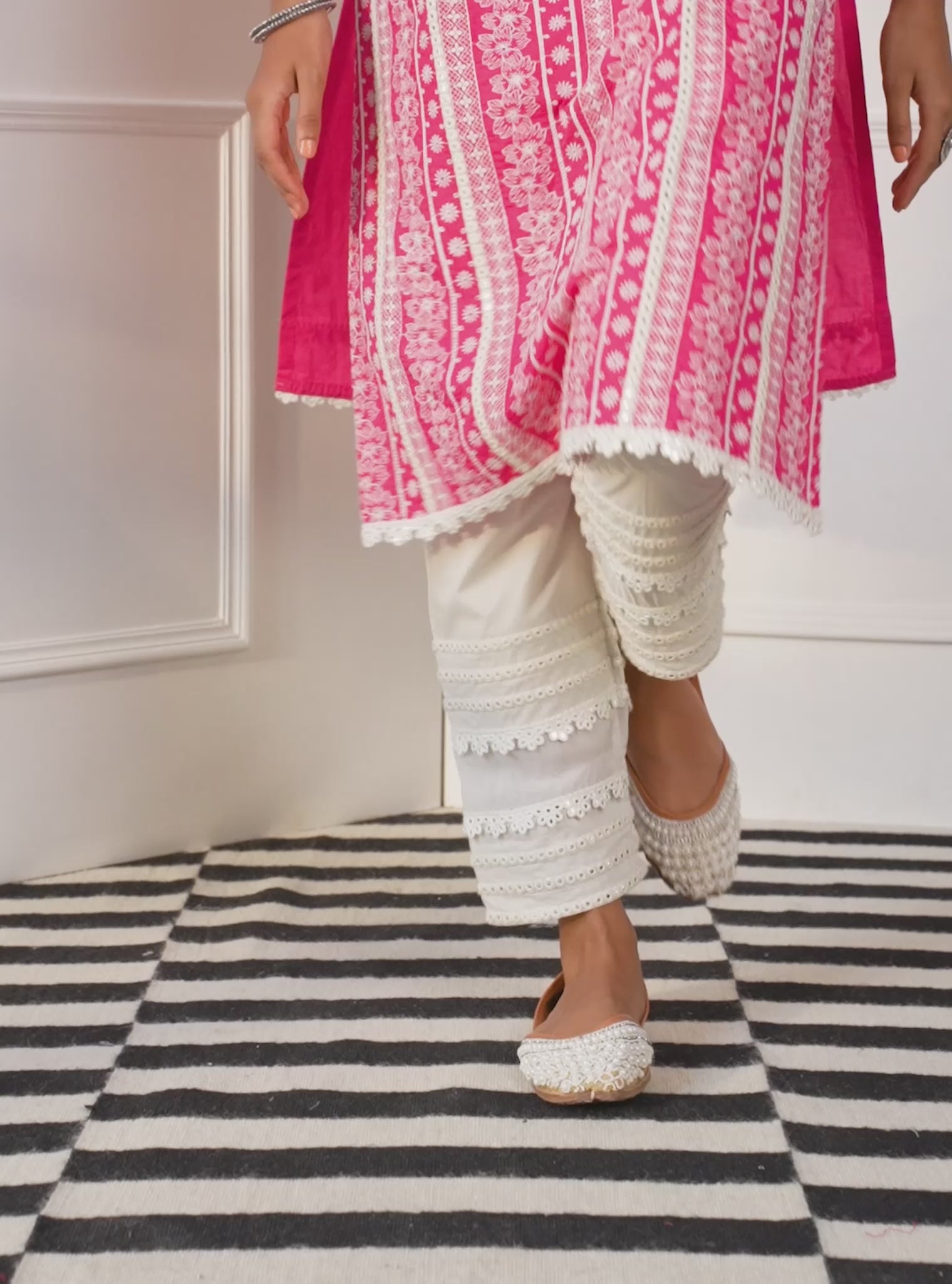 Mulmul Cotton Patricia Pink Kurta with Mulmul Cotton Mirror Gota White Pant