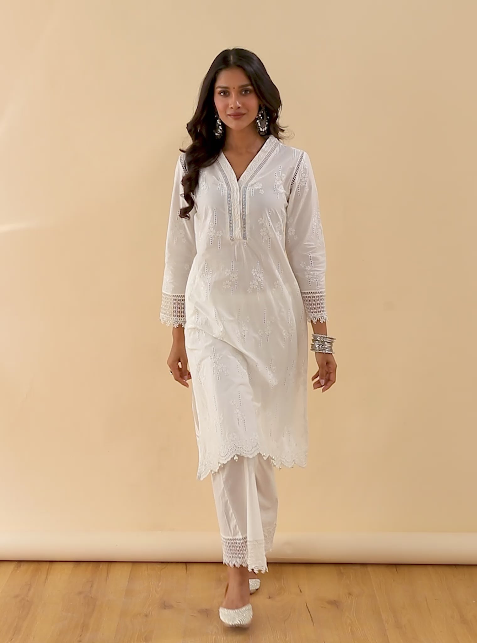 The Riwa Kurta is set in a classic white colour. It's made in 100% mulmul cotton fabric, resulting in an effortless balance of comfort and sophisticated structure. The Kurta set features feminine details including an embellished Vneckline and delicate floral needlework.