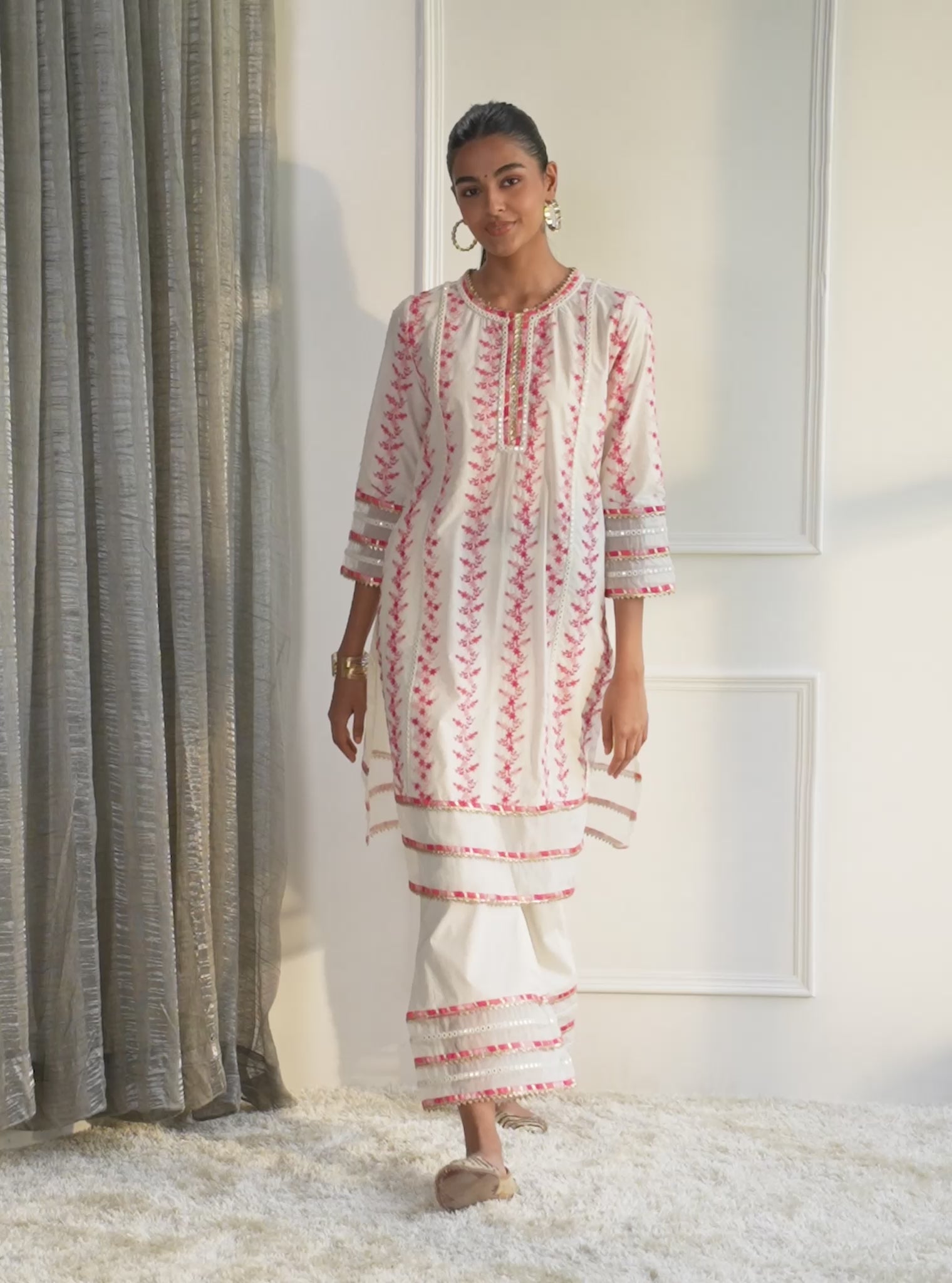 Mulmul Cotton Tiana Off White/Pink Kurta With Tiana Off White/Pink Pant