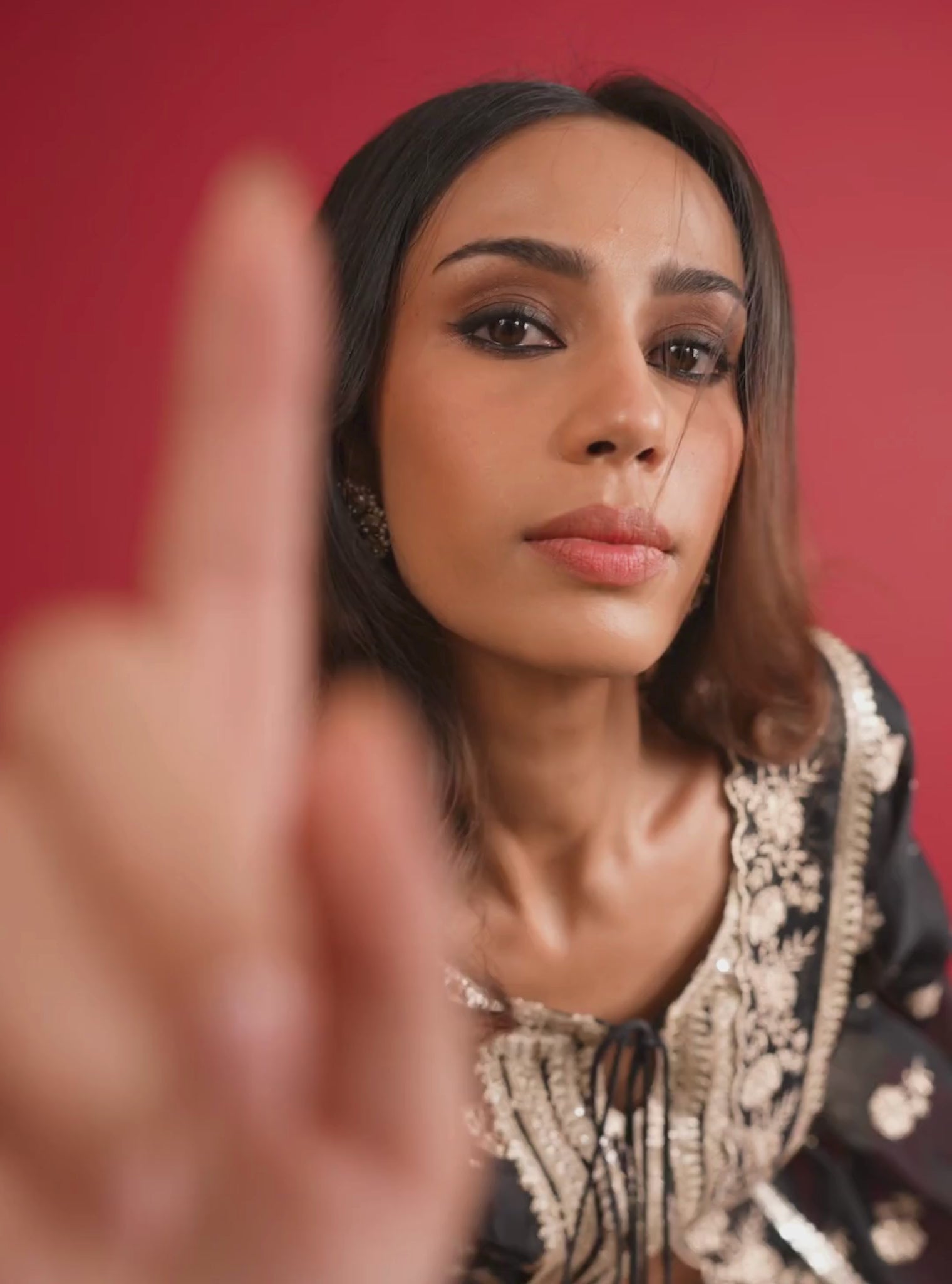 This A-line kurta set is crafted in softest cupro satin, detailed with intricate embroidery. Paired with dhoti-style satin pants and a flowing black organza dupatta, it’s a bold yet timeless choice for festive evenings.