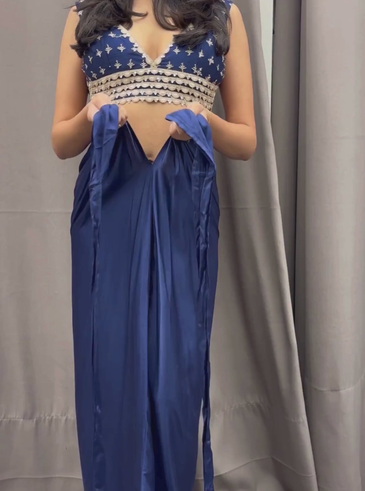 Elevate your contemporary wedding wardrobe with this alluring midnight blue, draped set. The delicate embroidery on the blouse and sheer long shrug add a hint of tradition, while the fluid-draped skirt introduces a modern twist to your look. The soft pleats and cinched waistline create a flattering silhouette, making this ensemble perfect for a chic cocktail or sangeet evening.