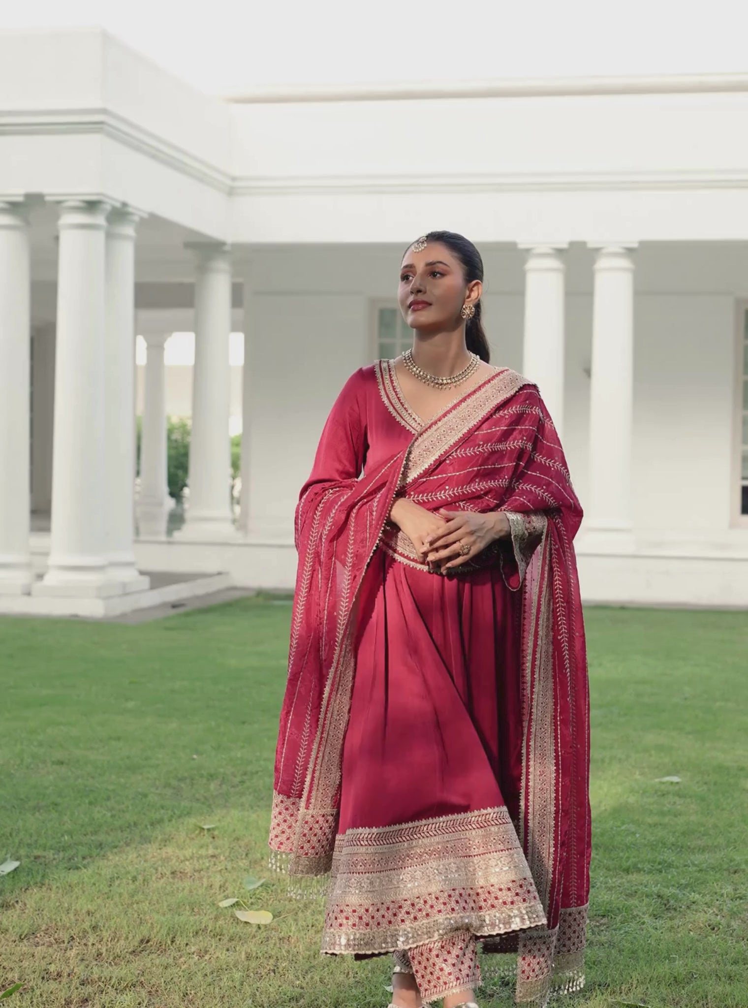 Rich and resplendent, this red Anarkali set embodies the grandeur of traditional celebration. Crafted from soft linen satin, the voluminous silhouette flows gracefully, creating an effortlessly regal presence. The yoke is adorned with intricate detailing that reflects fine craftsmanship, while delicate accents along the hem and sleeves enhance its opulent charm. Paired with sleek pima satin pants, the look is completed with a matching red viscose glass organza luxe Mausami dupatta- sheer, lightweight, and bordered with exquisite artistry.In a shade that commands attention, this ensemble is perfect for marking life’s special moments- from intimate festivities to grand cultural occasions.