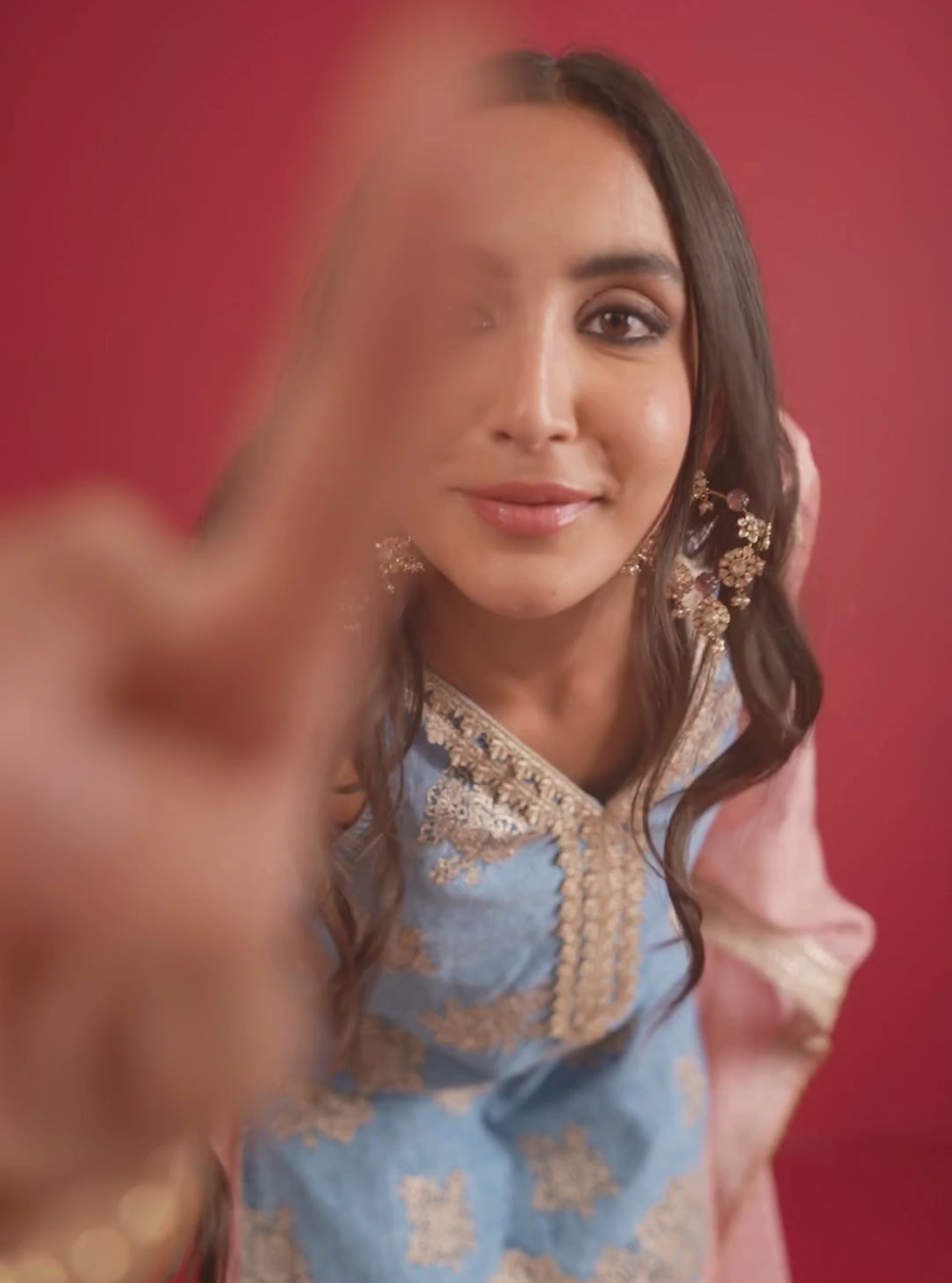 A denim cotton kurta paired with pink printed cupro salwar pants, styled with a lightweight pink organza dupatta. A playful mix of textures for a festive-ready look.