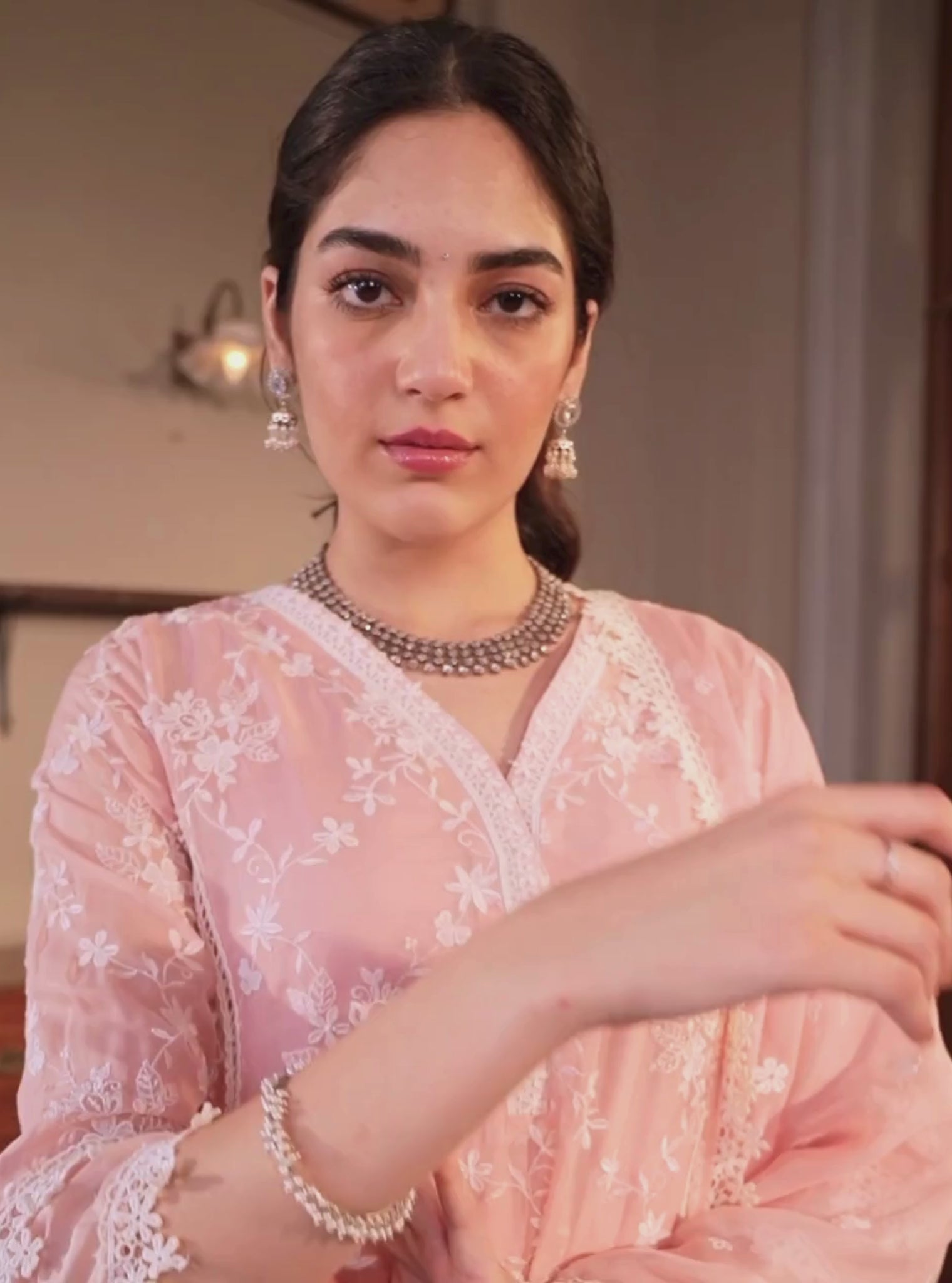 An enchanting A-line Kurta Set, designed to add an ethereal charm to your summer wardrobe. Crafted in a soothing pink shade, this set effortlessly transitions from daytime chic to evening elegance. The Kurta boasts a graceful A-line silhouette, accentuated with intricate lacework delicately tracing the neckline, sleeves, and hemline. Adorned with exquisite white thread embroidery throughout, it exudes timeless sophistication.