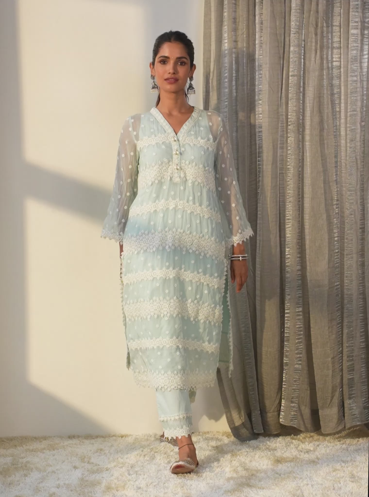 The Nessa organza set is a classic stunner, versatile in its ways and easy to style up or wear as is the kurta is delicate with broad lace trims running in horizontal panels with smaller cutie in between and over the sheer sleeves! Finished with matching pants this set in blue is fresh for the season and the upcoming months of light as love!