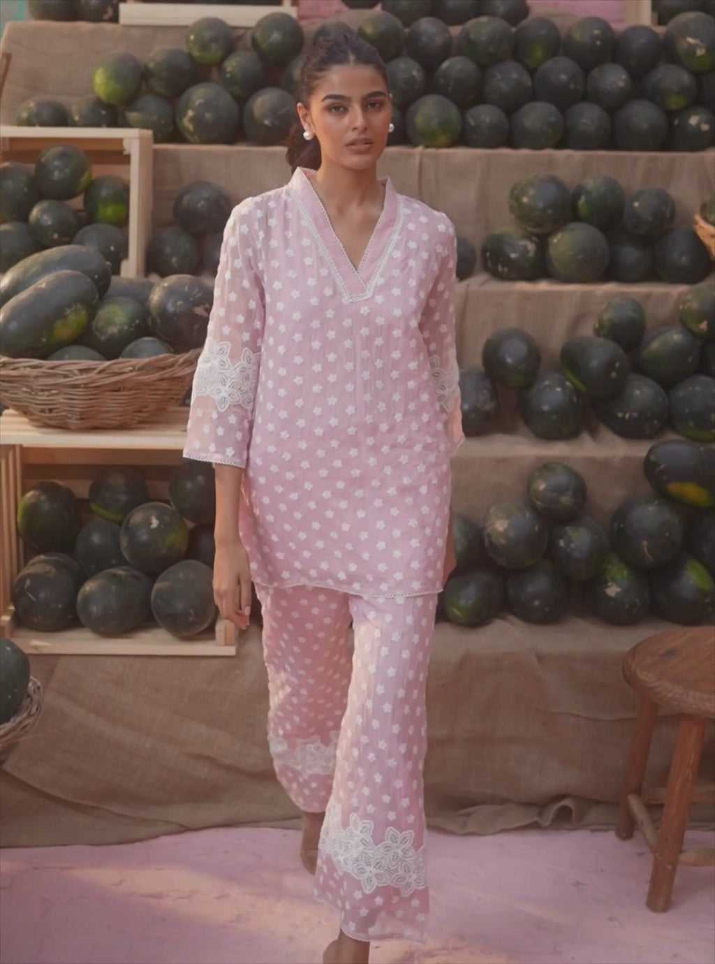 A soft pink set adorned with a subtle floral embroidery. The top has a delicate trim along its V neckline and hem, and the three-quarter sleeves are detailed with intricate lace accents. The trousers mirror the top's embroidery and are finished with a broad lace border at the hem.
