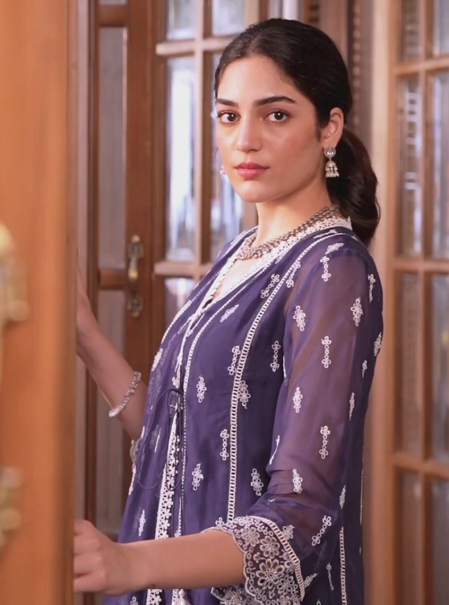An exquisite Angrakha-style ensemble in luxurious navy organza, tailored for your intimate summertime gatherings. Versatile and chic, this set seamlessly transitions from day to evening affairs with ease. Delicate white lace graces the neckline and hemline of the kurta, complemented by intricate white thread embroidery adorning the entirety of the garment. Matching the sleeves of the kurta, the straight trousers feature embroidered scalloped edges along the hemline, adding a touch of elegance to the ensemble.