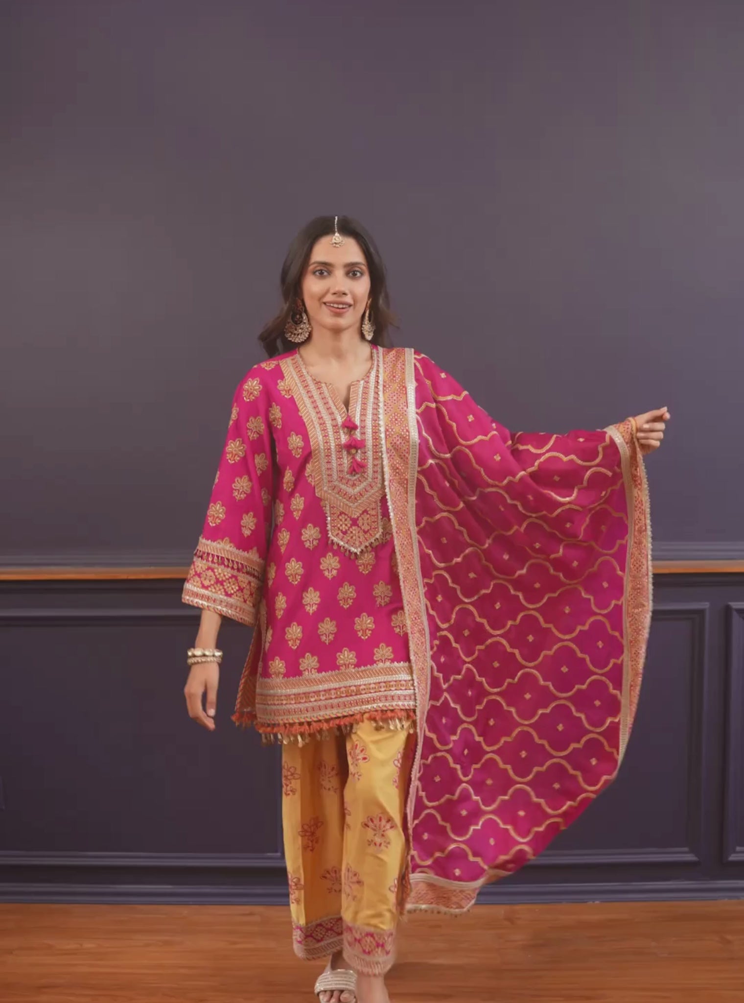 A vibrant pairing in festive tones; this fuschia kurta in soft pima satin is embroidered with fine detailing and paired with contrasting mustard pants. The look is completed with a fluid habotai silk dupatta for an elegant finish.